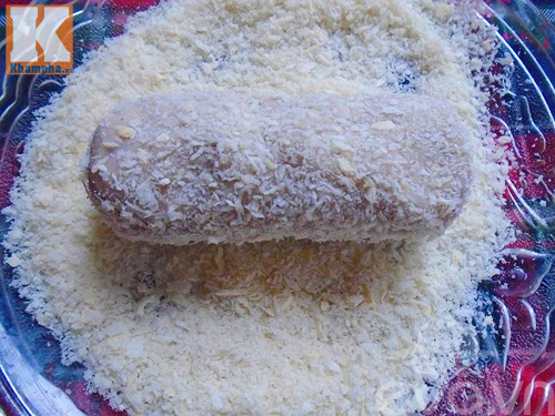 Bước 7: Đổ bột chiên giòn ra đĩa rồi lăn từng bánh qua lớp bột chiên giòn, lần lượt làm như vậy cho đến hết phần nguyên liệu.